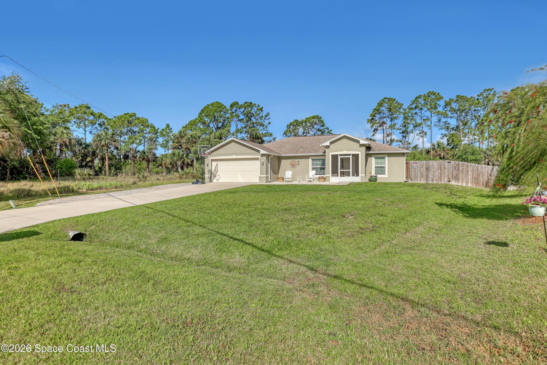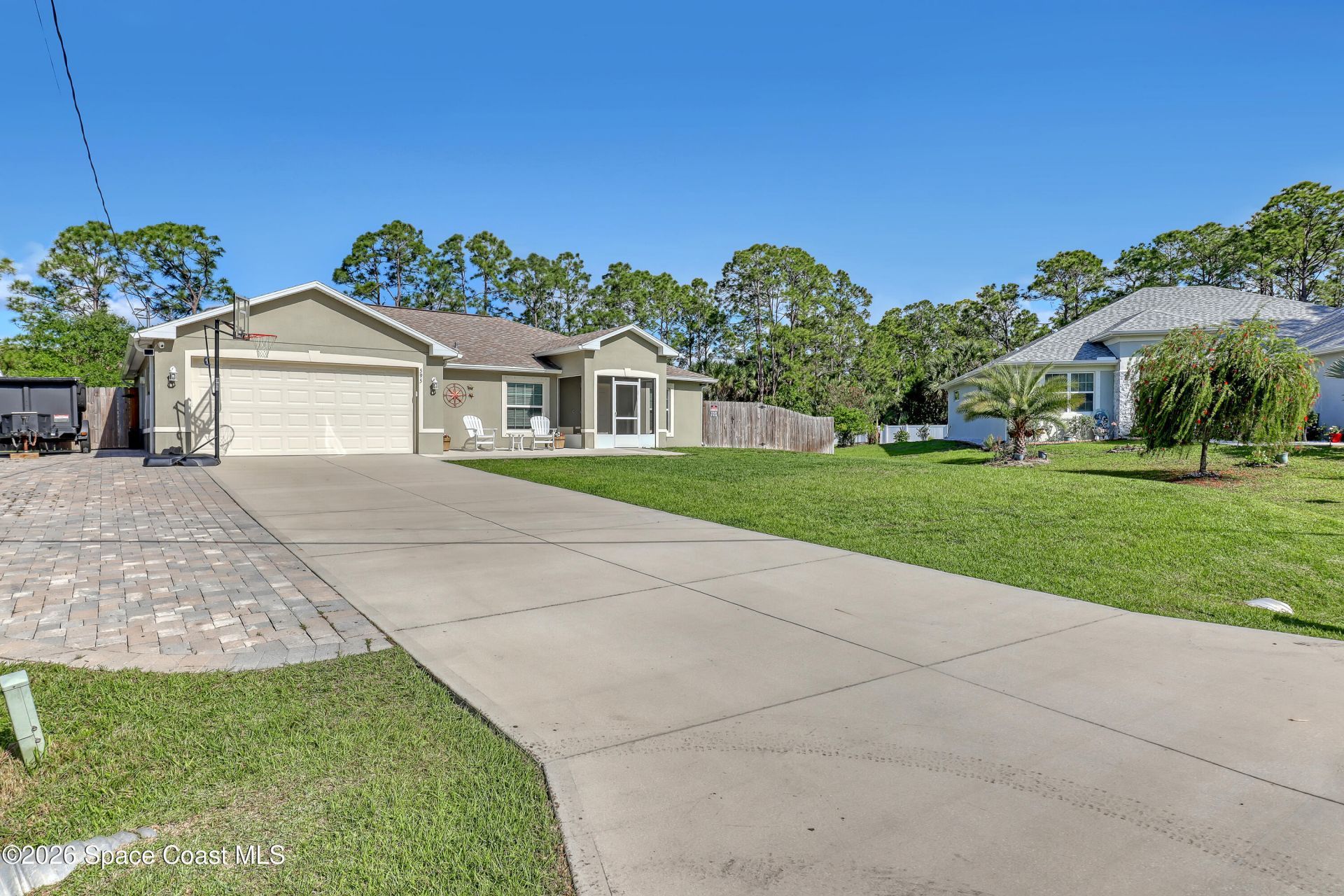 A rare opportunity to buy this meticulously maintained 2020 home situated on a 0.48-acre corner lot bordered by mature trees and a canal behind, offering privacy and the feel of even more space. The oversized driveway features added pavers extending to the rear--ideal for RVs, trailers, or work vehicles. The large FENCED backyard boasts a 10x16 shed and a beautiful rock fire pit. Enjoy outdoor living with a screened front/rear porch, and an additional uncovered concrete patio.Inside, has no carpet--tile throughout the main living areas and LVP in the bedrooms. The kitchen boasts 42 cabinets and a stylish backsplash, while the primary suite features a large walk-in shower. This 3/2 home also includes a flex room perfect for an office, gym, or hobby space.Recent updates include a new WH (2023) and appliances (2024, refrigerator 2022). Convenient access to schools-elementary and high school within 2 miles, and the middle within 4. With comfort and privacy, this one is worth showing!